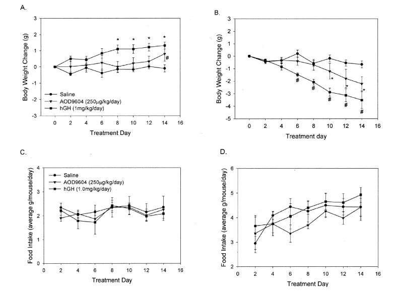 Heffereman et. Al conducted another study regarding the effects of AOD9604 on weight loss and fat oxidation rates, as well as to see how AOD9604 interacted with the receptor for human growth hormone (hGH). Obese and lean mice were given either saline, AOD9604, or hGH through an osmotic pump over the course of 14 days. Variables such as body weight, calorie intake, energy expenditure, glucose, and fat oxidation, insulin, and glycerol were measured before and after treatment with AOD9604 and hGH.