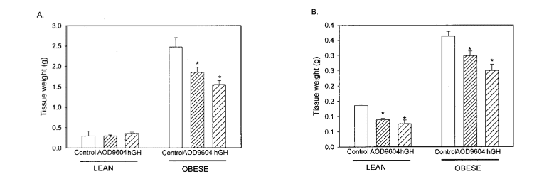 Further analysis revealed differential effects on fat depots. In lean mice, neither hGH nor AOD9604 significantly altered the weight of epididymal white adipose tissue. However, in ob/ob mice, AOD9604 and hGH significantly reduced epididymal fat mass by 28% and 40%, respectively. Both compounds also decreased the mass of brown adipose tissue in lean and obese mice, suggesting a broader effect on adipose tissue metabolism [2].